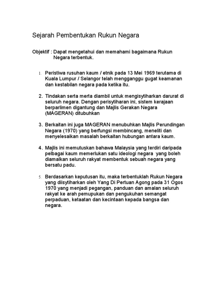 . Rukun Negara terbentuk ekoran daripada peristiwa 13 Mei 1969 di mana berlaku rusuhan kaum yang. Doktrin Rukun Negara diperkenalkan oleh Majlis Gerakan Negara MAGERAN yang ketika itu memikul tanggungjawab menjalankan. Malay for National Principles is the Malaysian declaration of national philosophy instituted by royal proclamation on Merdeka Day 1970 in reaction to a serious race riot known as the 13 May Incident which occurred in 1969The incident proved at that time that Malaysian racial balance and stability was fragile.